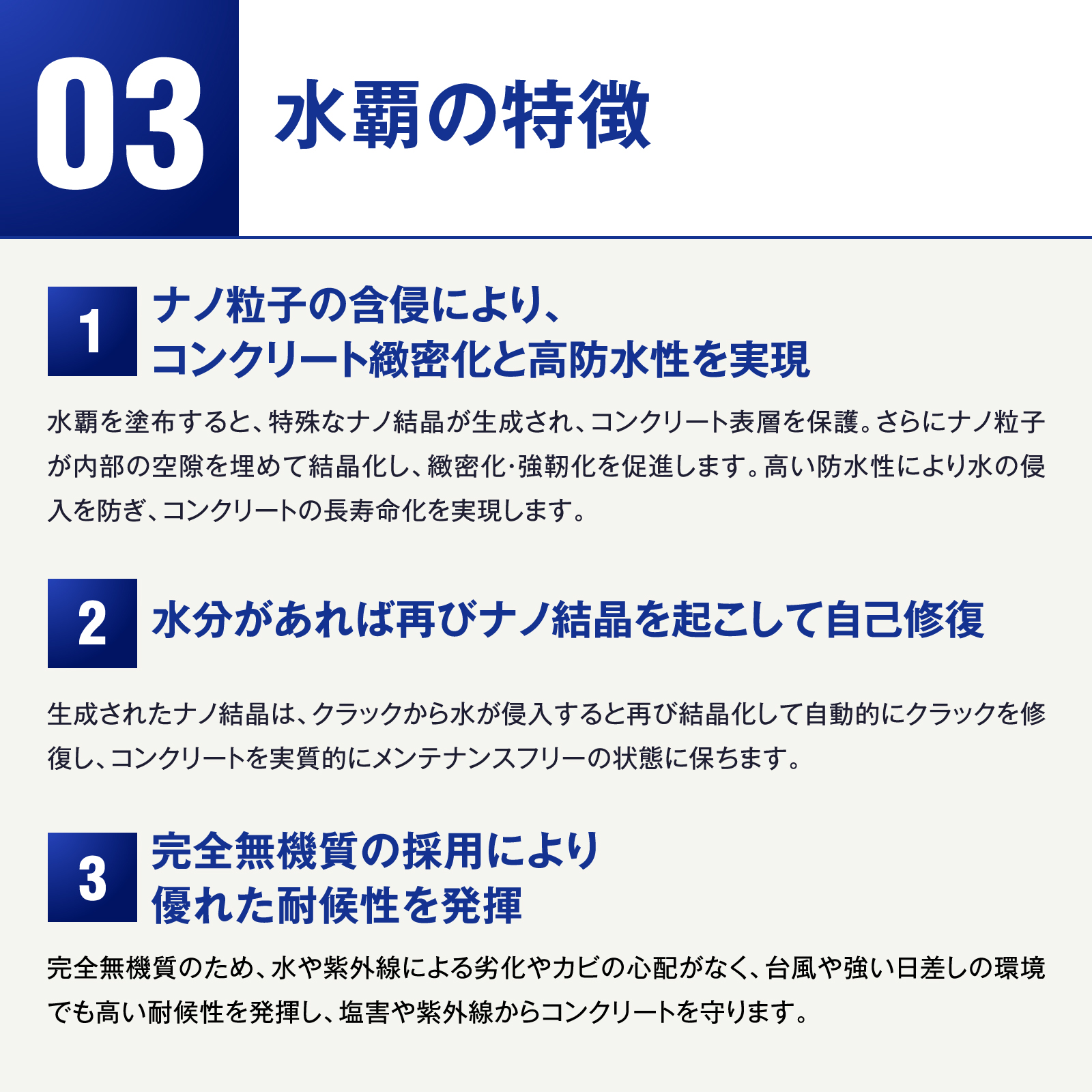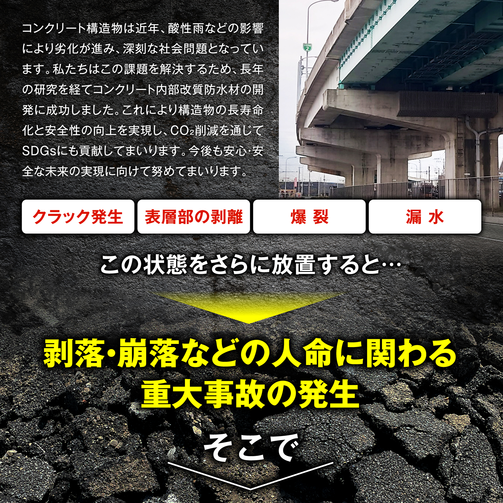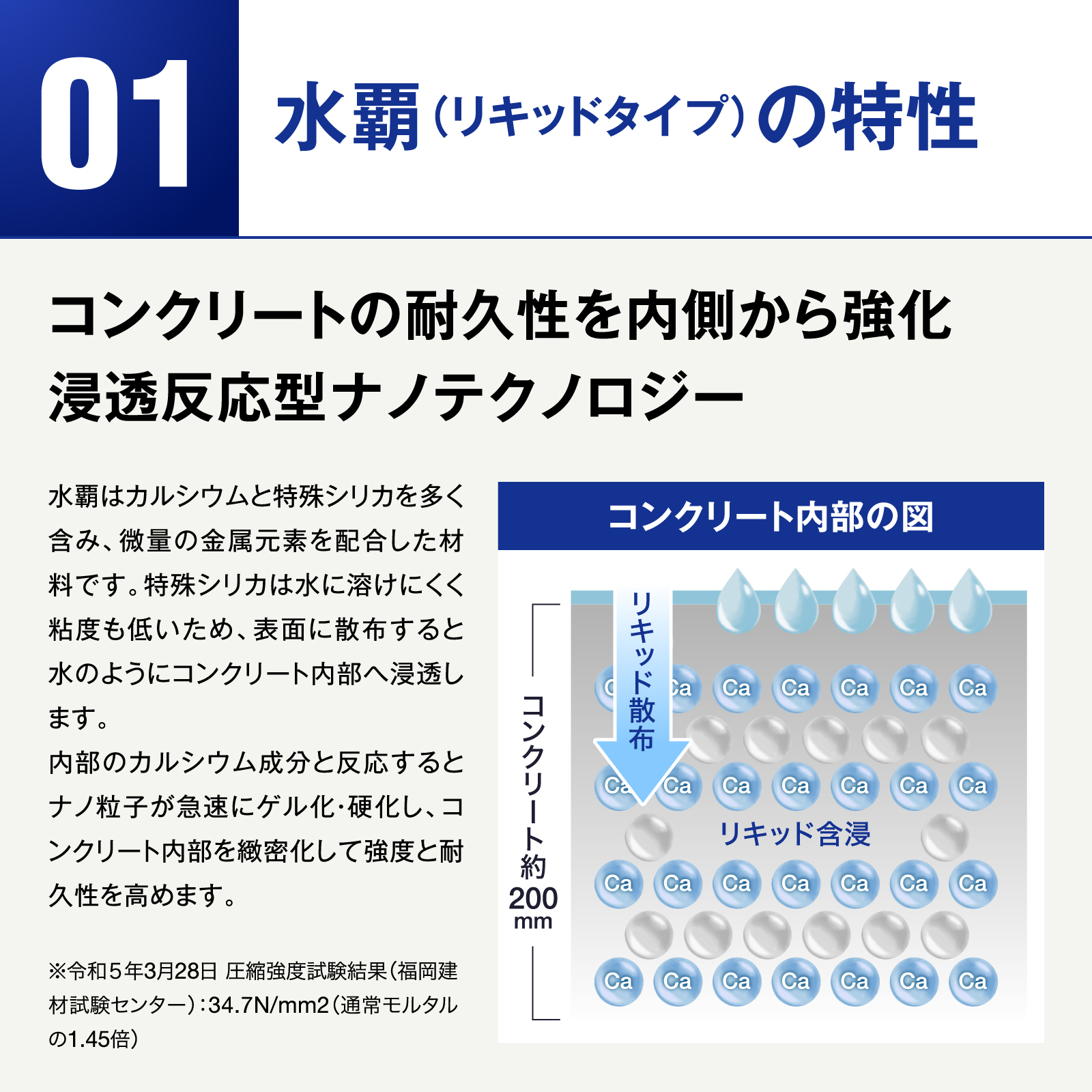 | 商品説明 | 水溶液タイプで含侵速度が速いことに加えて、 施工が簡単であり、既存のコンクリート構造物 の外見を変えることなく、防水工事可能です。 |
